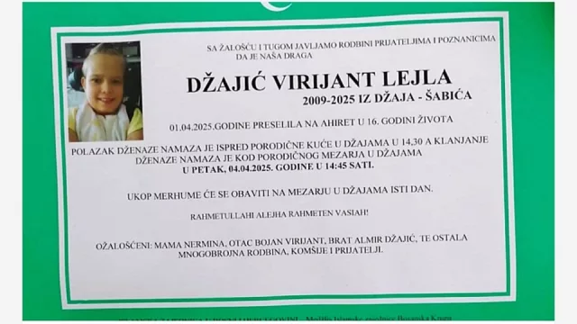 Tužna srca i s bolom u dušu obavlještavamo da je preselila Džajić Virijant Lejla na ahiret 01.04.2025. god. u 16. godini života.