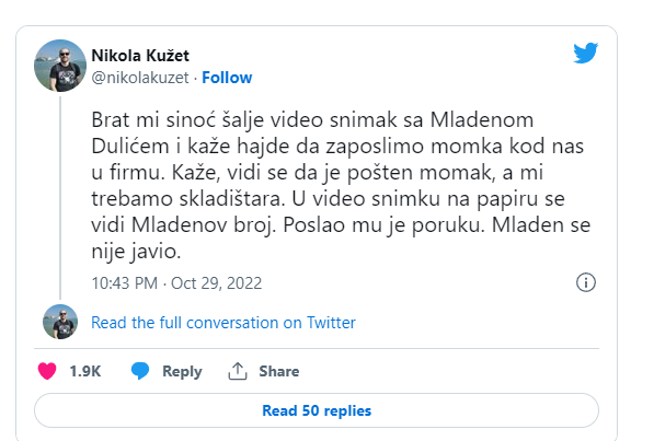 Naime, Nikola Kužet, vlasnik jedne firme, na Tviteru je objavio kako je planirao da zaposli Mladena nakon što je pogledao video.