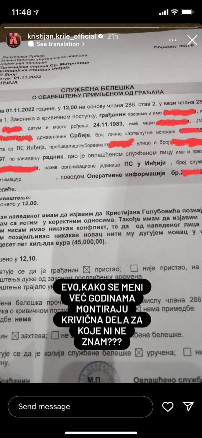 Njemu je stigao papir iz policijske stanice Inđija, a u izjavi vidimo da NN lice izjavljuje da ne duguje Kristijanu novac, niti da je pozajmljivao od njega 45.000 evra, kao i to da nisu imali konflikt.