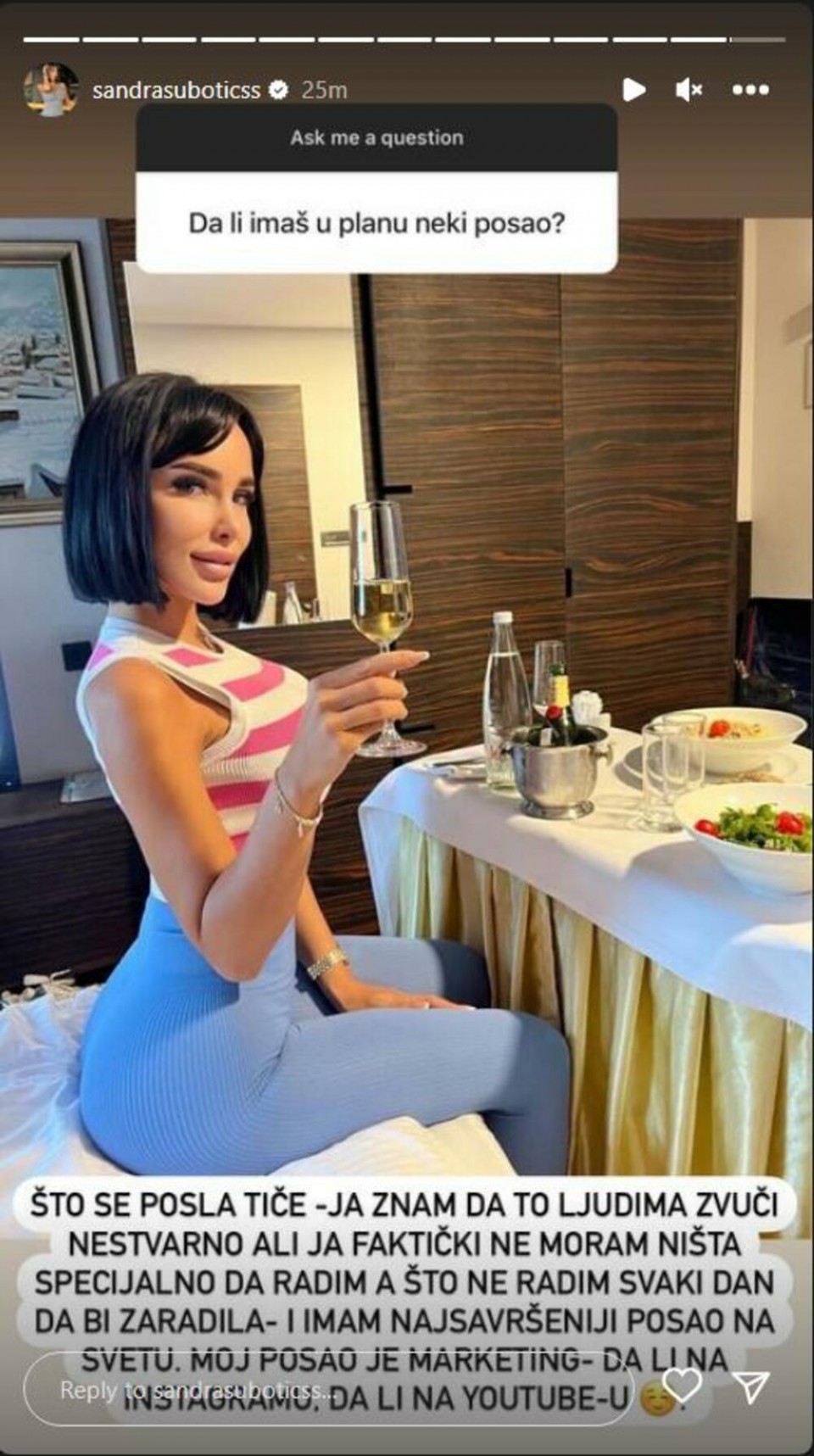 “Što se posla tiče, ja znam da to ljudima zvuči nestvarno, ali ja faktički ne moram ništa specijalno da radim, a što ne radim svaki dan da bih zaradila i imam najsavršeniji posao na svijetu. Moj posao je marketing – da li na Instagramu ili na Jutjubu”, napisala je ona.
