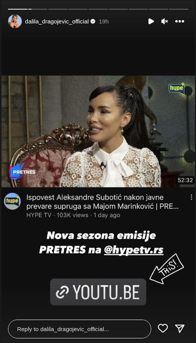 Reč je o najavi koju je Dalila “morala” da okači na svoj instagram, a to je intervju njene dugogodišnje rivalke Aleksandre Subotić koja, ni manje ni više, govori o prevari svog muža sa još jednom Dalilinom rivalkom – Majom Marinković.