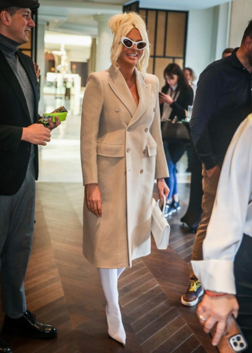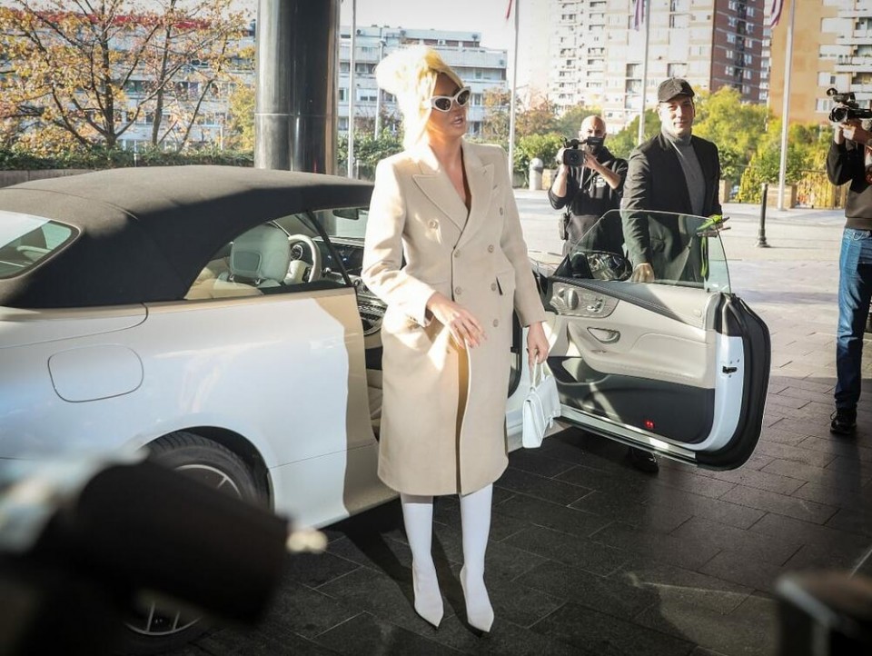 Karleuša je došla i velikom stilu, a na sebi je ima dugačku balenciaga kaput u bež boji, koji košta 2.790 eura, tašna takođe balenciaga, bijele naočare od 500 evra, i čizme na visoku štiklu u istoj boji.