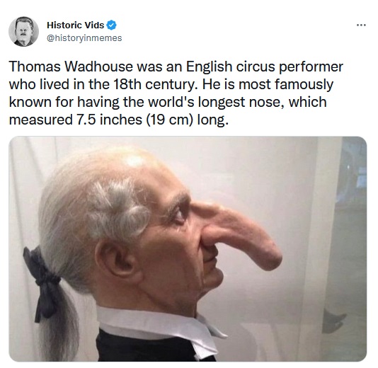 Postoje historijski izvještaji da je Tomas Wedders, koji je živio u Engleskoj tokom 1770-ih i bio član putujućeg cirkusa, imao nos dug 19 cm – piše na zvaničnoj stranici Guinnessove knjige rekorda.