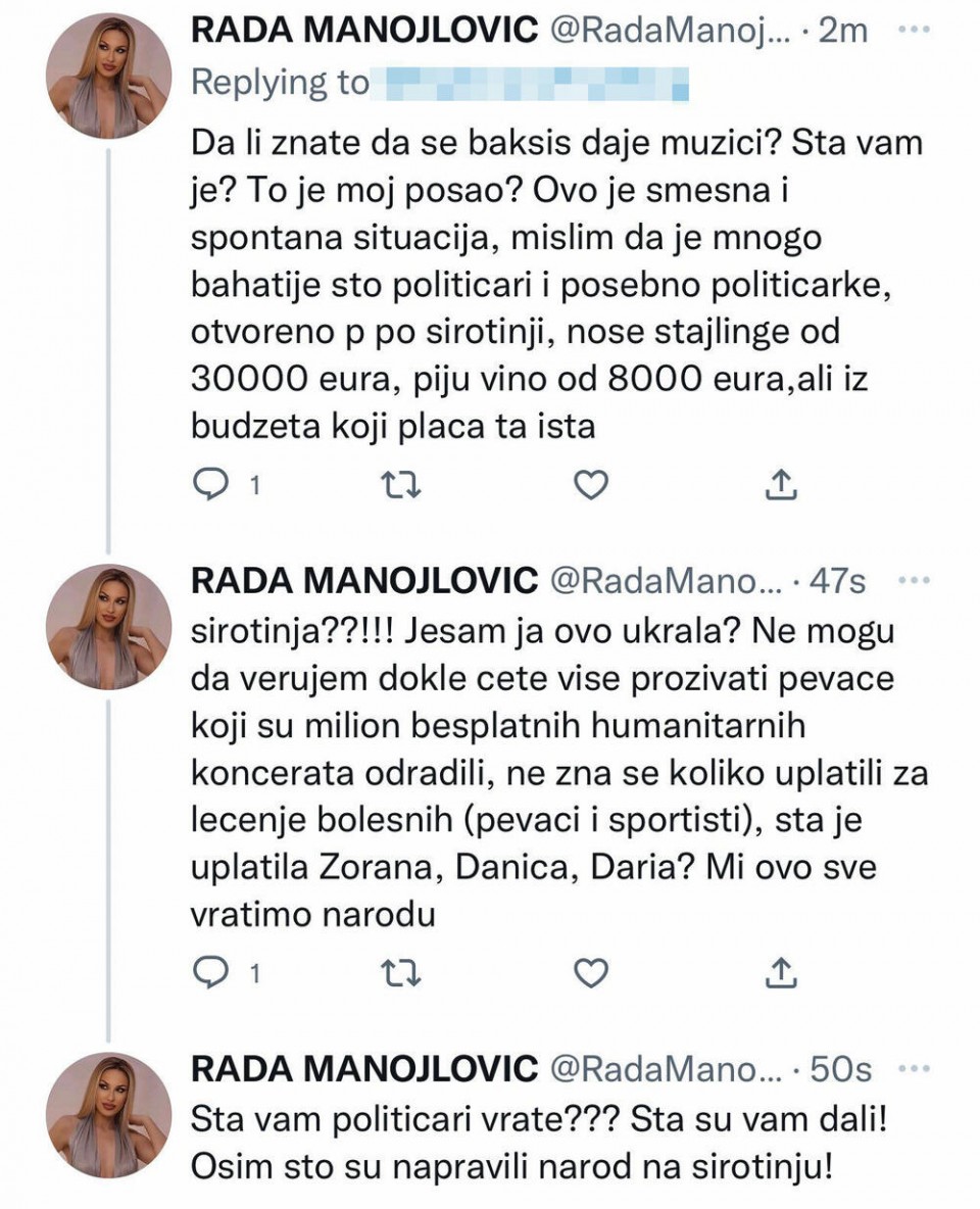 Rada je potom napisala još jedan tvit u kojem je oplela po Zorani Mihajlović, bivšoj ministarki.