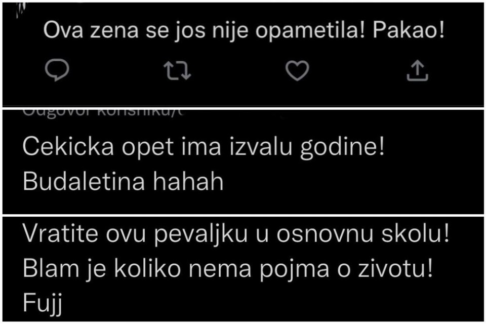 – Ova žena se još nije opametila! Čekićka opet ima izvalu godine! Budaletina! Vratite ovu pjevaljku u osnovnu školu! Blam koliko ova Čekićka nema pojma o životu! – samo su neki od komentara.