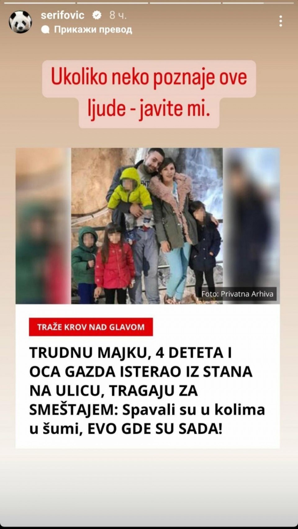 Mariju Šerifović ganula je priča objavljena u Kuriru o porodici Ćirić, koja je spavala u kolima u Bojčinskoj šumi nakon što ih je u nedjelju stanodavac izbacio iz stana sa četvoro djece i petim na putu!