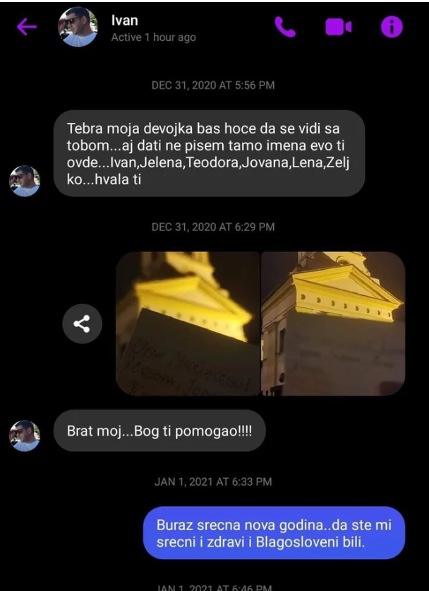 – Tebra, moja devojka baš hoće da se vidi sa tobom… Aj da ti ne pišem tamo imena, evo ti ovde… Ivan, Jelena, Teodora, Jovana, Lena, Željko… Hvala ti – napisao je Marinković svom prijatelju, koji mu je poslao fotografiju imena ispred manastira.