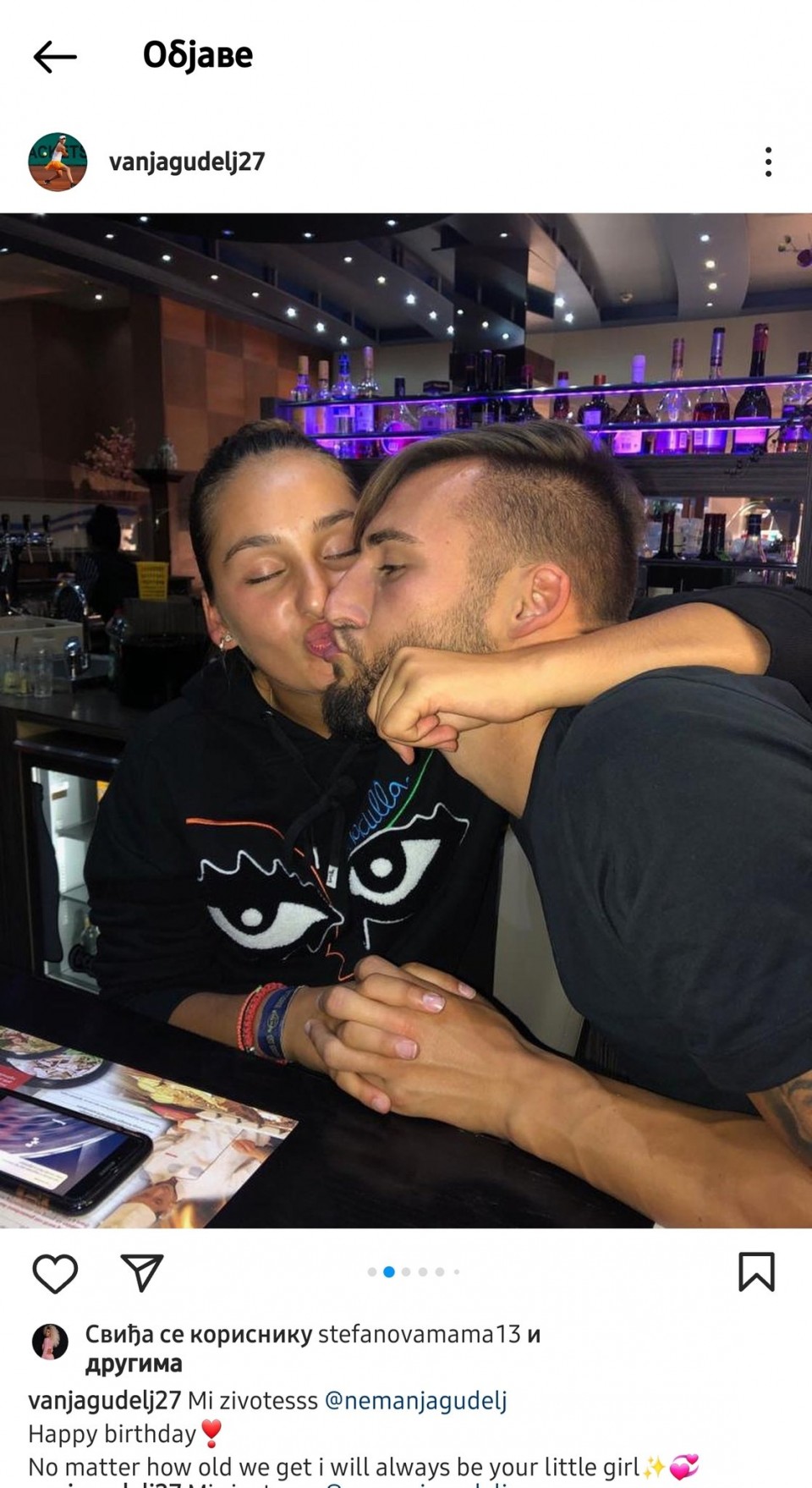 Korisnicima društvenih mreža je za oko posebno zapala fotografija na kojoj Vanja Gudelj, mlađa sestra Nemanje Gudelja, brata ljubi direktno u usta.
