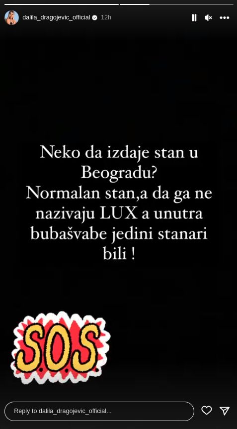– Neko da izdaje stan u Beogradu? Normalan stan, a da ga ne nazivaju “luks”, a unutra bubašvabe jedini stanari bili – istakla je Dragojevićka na svom storiju uz nalepnicu ‘SOS’ što znači da se ona i Marijana već nalaze u opasnosti da ostanu bez krova nad glavom.