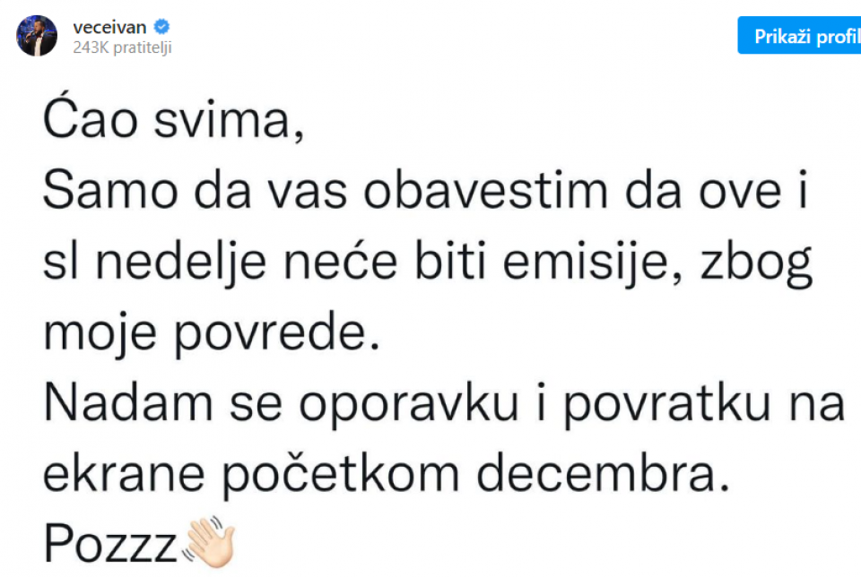 – Ćao svima, samo da vas obavijestim da ove i sljedeće nedjelje neće biti emisije, zbog moje povrede. Nadam se oporavku i povratku na ekrane početkom decembra. Pozdrav – napisao je Ivanović kratko.