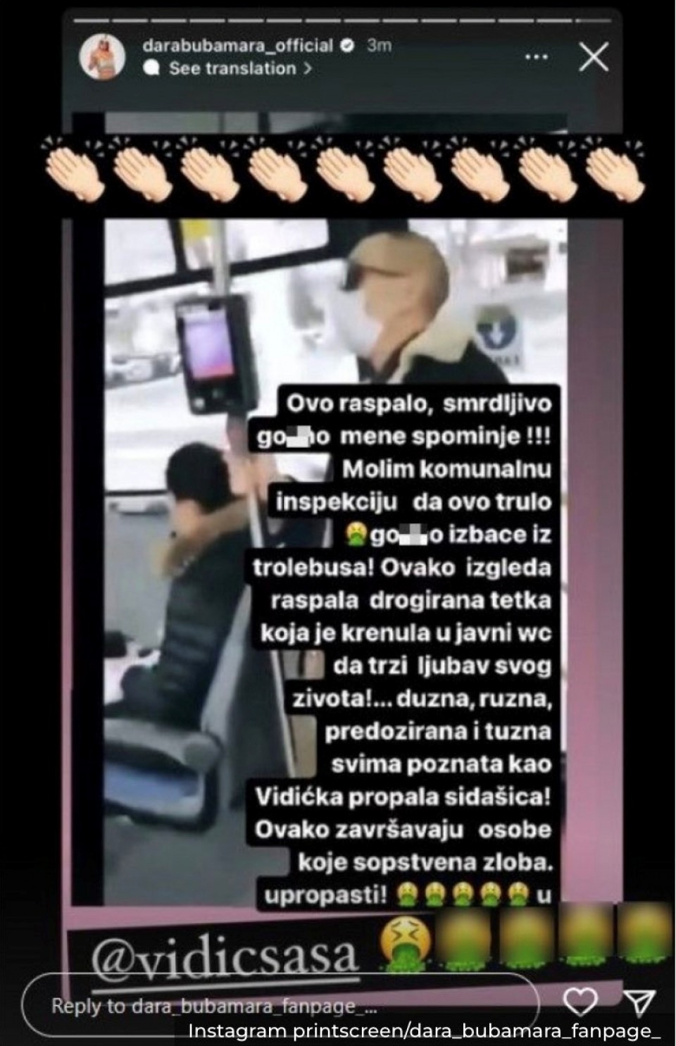 – Ovo raspalo, smrdljivo g..no mene spominje! Molim komunalnu inspekciju da ovo trulo g..no izbace iz trolejbusa! Ovako izgleda raspala dr.girana tetka, koja je krenula u javni WC da traži ljubav svog života! Dužna, ružna, predozirana i tužna, svima poznata kao Vidićka propala sidašica! Ovako završavaju osobe koje sopstvena zloba upropasti – napisala je bijesna Dara, koja je poslije nekoliko sati sporni snimak i uvrede izbrisala.