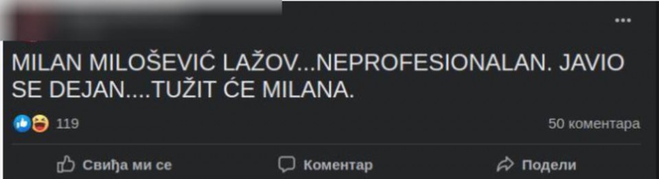 – Milan Milošević je lažov… Neprofesionalan! Javio se Dejan! Tužiće Milana – glasi objava na popularnoj Fejbuk stranici, fan stranici Zadruge.