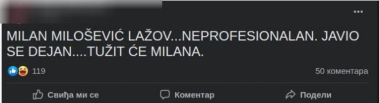 – Milan Milošević je lažov… Neprofesionalan! Javio se Dejan! Tužiće Milana – glasi objava na popuilarnoj Fejbuk stranici, fan stranici Zadruge.