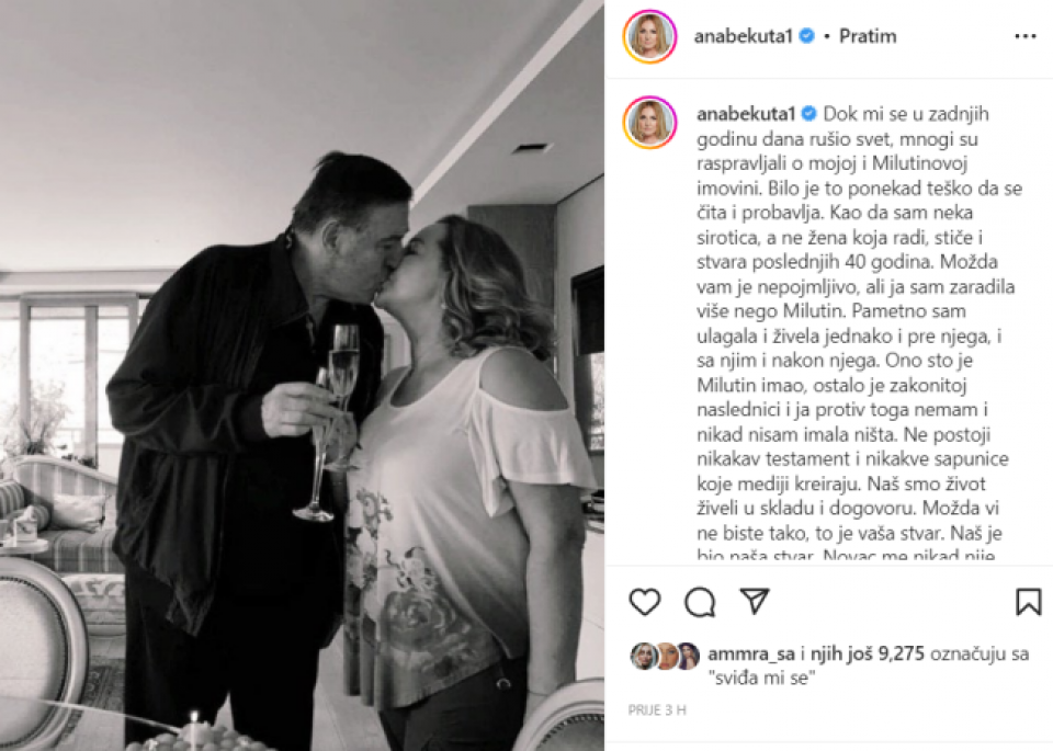– Tužno je gledati koliko je nekima nevjerovatno da žena ima, da je žena zaradila, stvorila i stekla bez muškarca. Ako je tako nešto nevjerovatno u 21. vijeku, mi kao narod imamo ozbiljan problem. Svim djevojkama želim da pronađu ljubav kakvu sam ja pronašla u Milutinu. Za pare se pobrinite same. Tako je slađe – napisala je Ana.