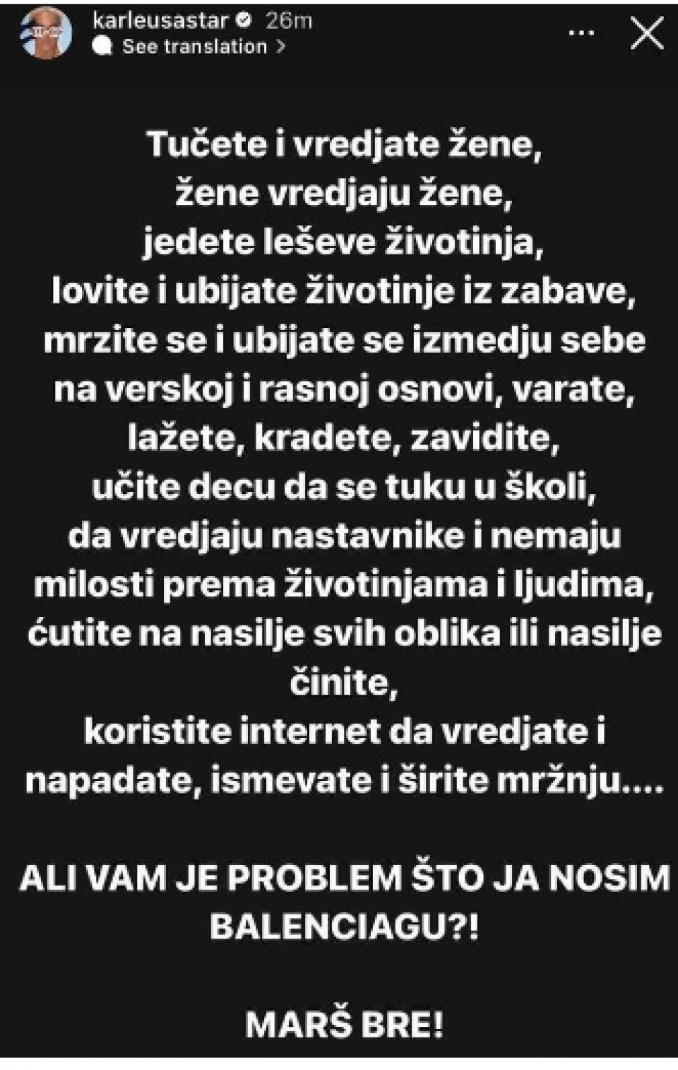 “T…e i vrijeđate žene, žene vrijeđaju žene, jedete l…e životinja, lovite i u…e životinje iz zabave, mrzite se, u…e na vjerskoj i rasnoj osnovi, varate, lažete, kradete, zavidite, učite djecu da se t..u u školi, da vrijeđaju nastavnike i nemaju milosti prema životinjama i ljudima, šutite na n…e svih oblika ili n…e činite, koristite internet da vrijeđate i napadate, ismijavate i širite mržnju… Ali vam je problem što ja nosim Balenciagu? M.š, bre”, napisala je na Instagramu.