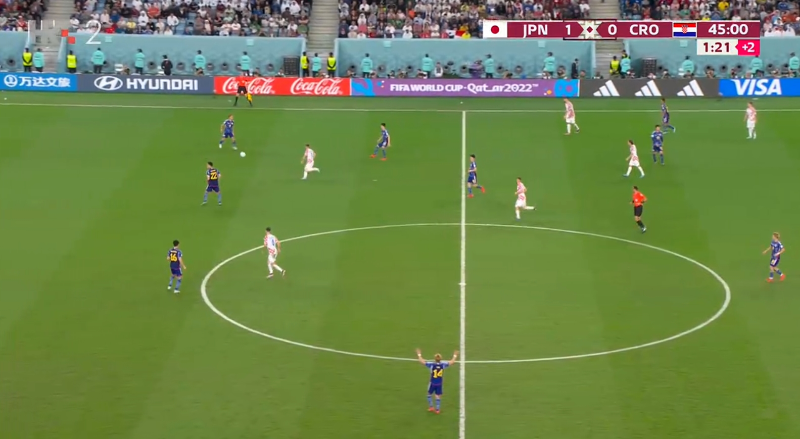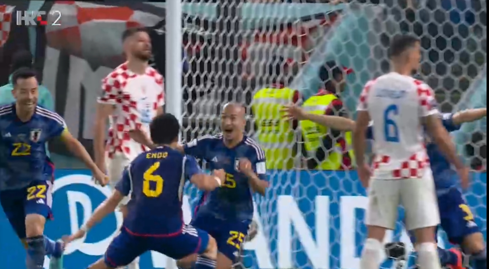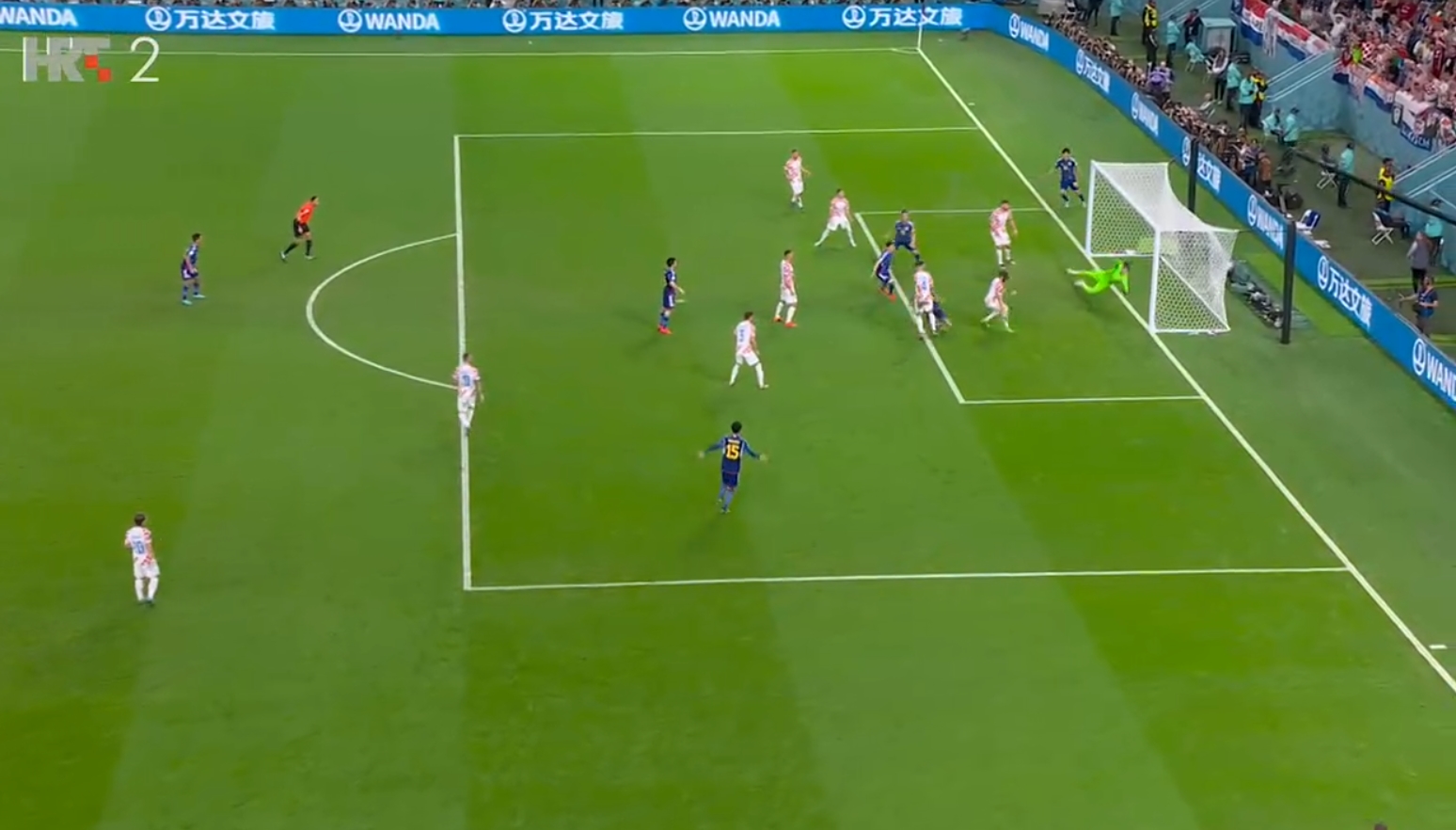 Dobio je Japan korner jeftino, a poslije njega uslijedio je još jedan gdje su pokušali pomoćnom igrom, umjesto direktnog centaršuta nadmudriti znatno više Hrvate, što im je i pošlo za rukom. Lopta se odbila na nogu Maede koji pogađa za 1:0.