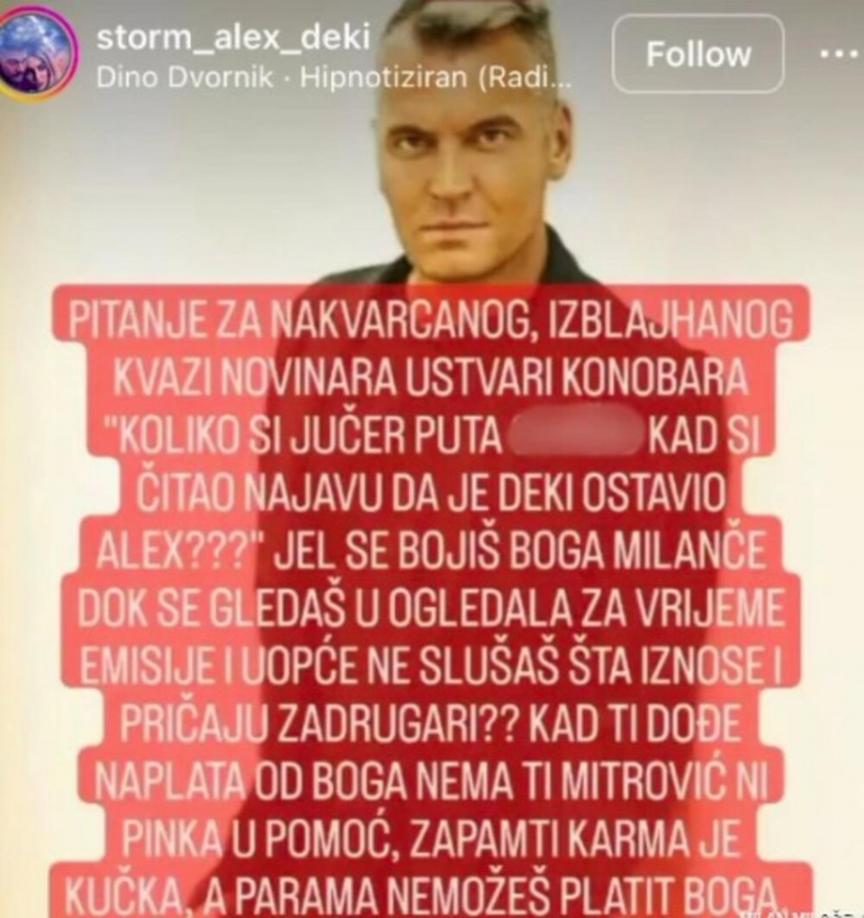 – Pitanje za nakvarcanog, izblajhanog kvazinovnara, u stvari konobara: ”Koliko si puta uživao dok si čitao najavu da je Deki ostavio Aleks?” Je l’ se bojiš Boga Milanče dok se gledaš u ogledala za vrijeme emisije i ne slušaš šta zadrugari pričaju. Kad ti dođe naplata od Boga neće ti Mitrović pomoći, zapamti karma je k.čka – napisali su između ostalog u okviru storija.