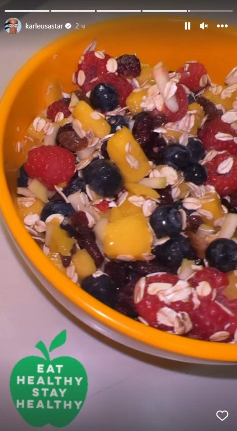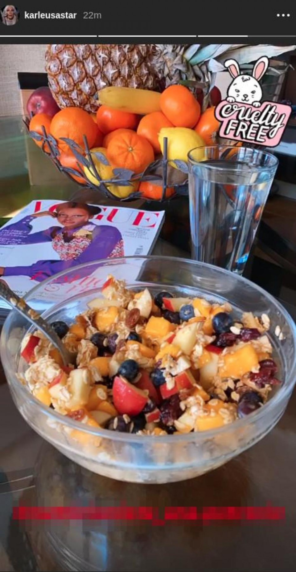 Doručak: Ovsene pahuljice 4 kašike, voćni miks, čia semenke Užina: 300g trešanja Ručak: Zapečena boranija s povrćem, salata Večera: Kiselo mlijeko 360ml, salata