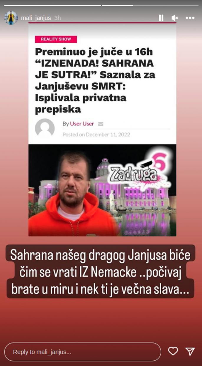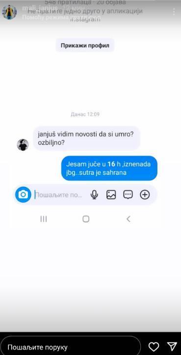 Janjuš je objavio privatnu prepisku na Instagram stori koja je šokirala mnoge, u kojoj se navodi vest o njegovoj smrti.