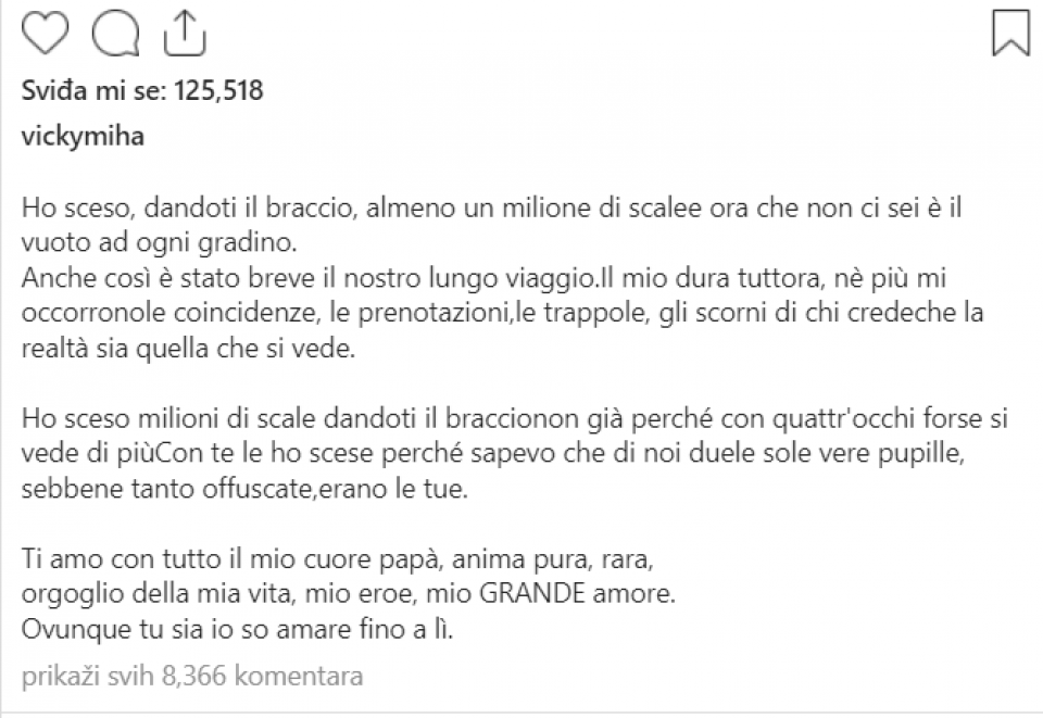 Viktorija, kćerka preminulog Siniše Mihajlovića, oglasila se prvi put poslije smrti oca. Ona je na društvenim mrežama ostavila poruku koja slama i najtvrđa srca.