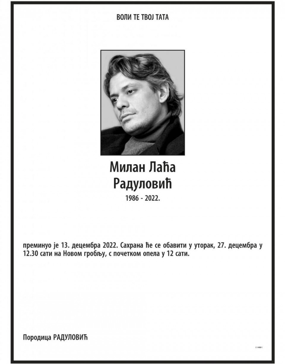 Milan Radulović Laća biće sahranjen u utorak 27. decembra u 12.30 sati na Novom groblju, a opelo će početi u 12 sati.