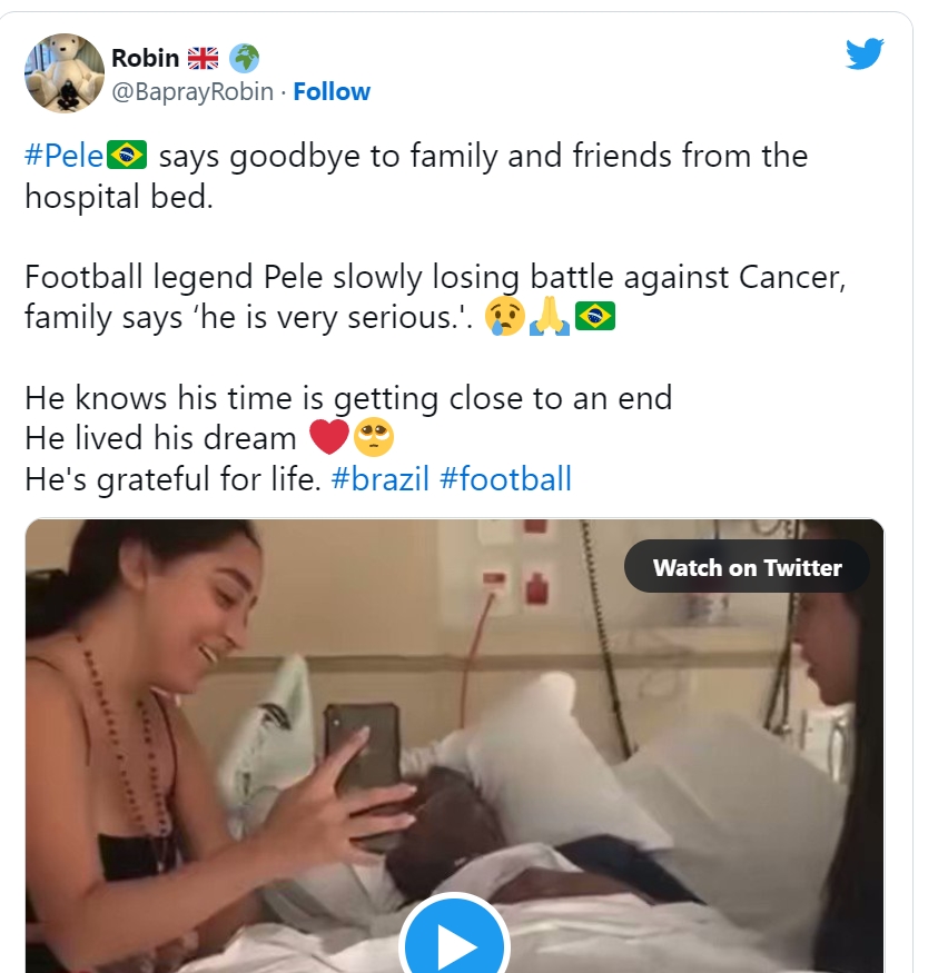 Pele (82), koji se liječio od raka debelog crijeva, primljen je u bolnicu 29. novembra nakon što se njegovo stanje drastično pogoršalo.