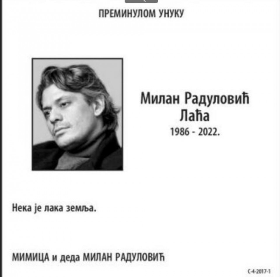 “Preminulom unuku, neka je laka zemlja. Mimica i deda Milan Radulović”, piše u čitulji.