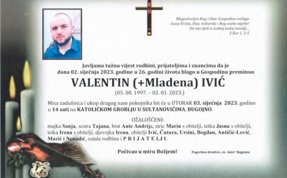 Preminuo je mladić Valentin Ivić u 26. godini života.