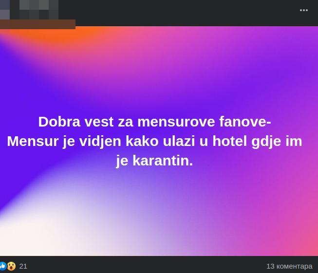 – Dobra vest za Mensurove fanove – Mensur je viđen kako ulazi u hotel gde im je karantin – glasila je objava.