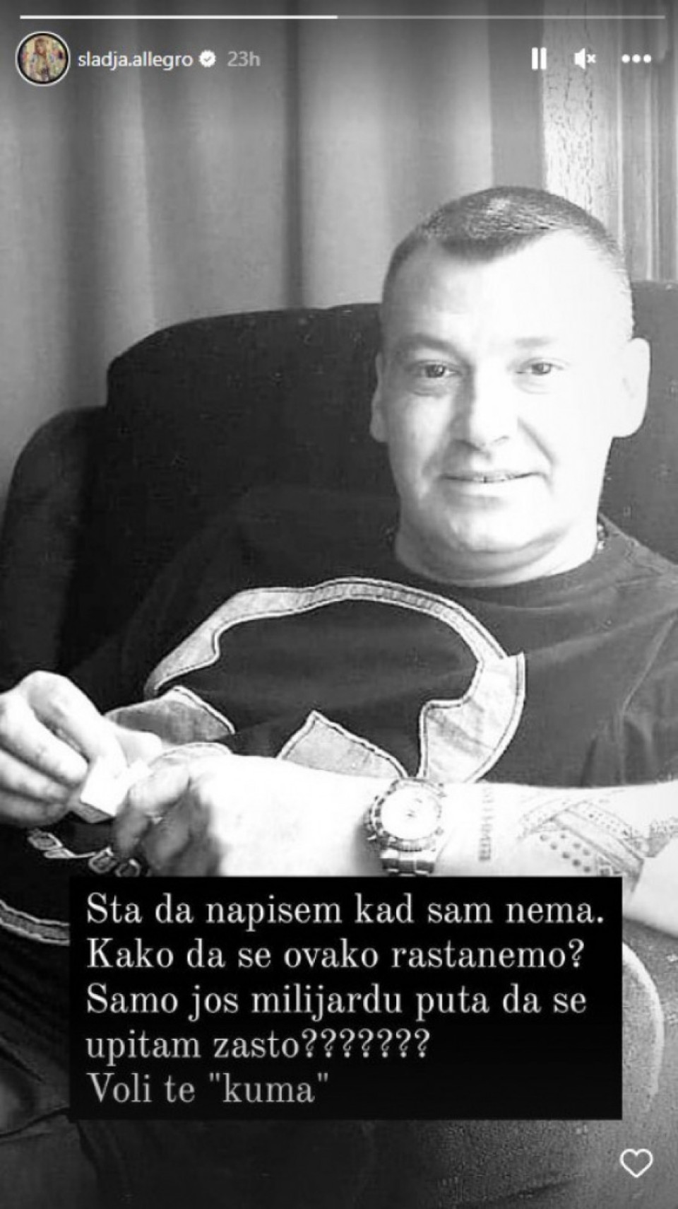 – Šta da napišem kad sam nijema? Kako da se ovako rastanemo? Samo još milijardu puta da se upitam zašto? Voli te kuma – emotivnim riječima odala je počast pjevačica svom voljenom prijatelju.
