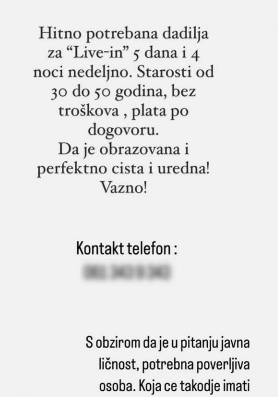 – Hitno potrebna dadilja z a”Live-in” 5 dana i 4 noći nedjeljno. Starosti od 30 do 50 godina, bez troškova, plata po dogovoru – napisala je ona, pa dodala: