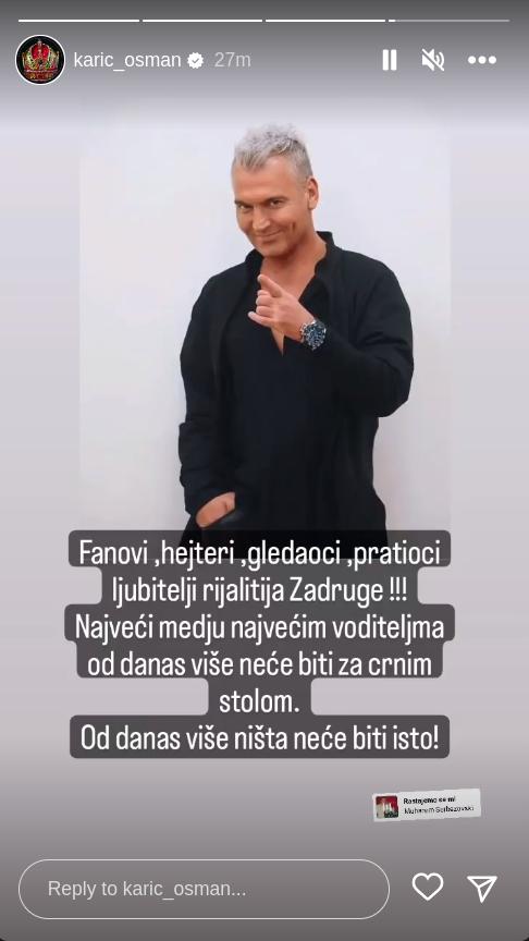 – Fanovi, hejteri, gledaoci, pratioci, ljubitelji rijalitija “Zadruge”, najveći među najvećim voditeljima od danas više neće biti za crnim stolom. Od danas više ništa neće biti isto – istakao je Osman.