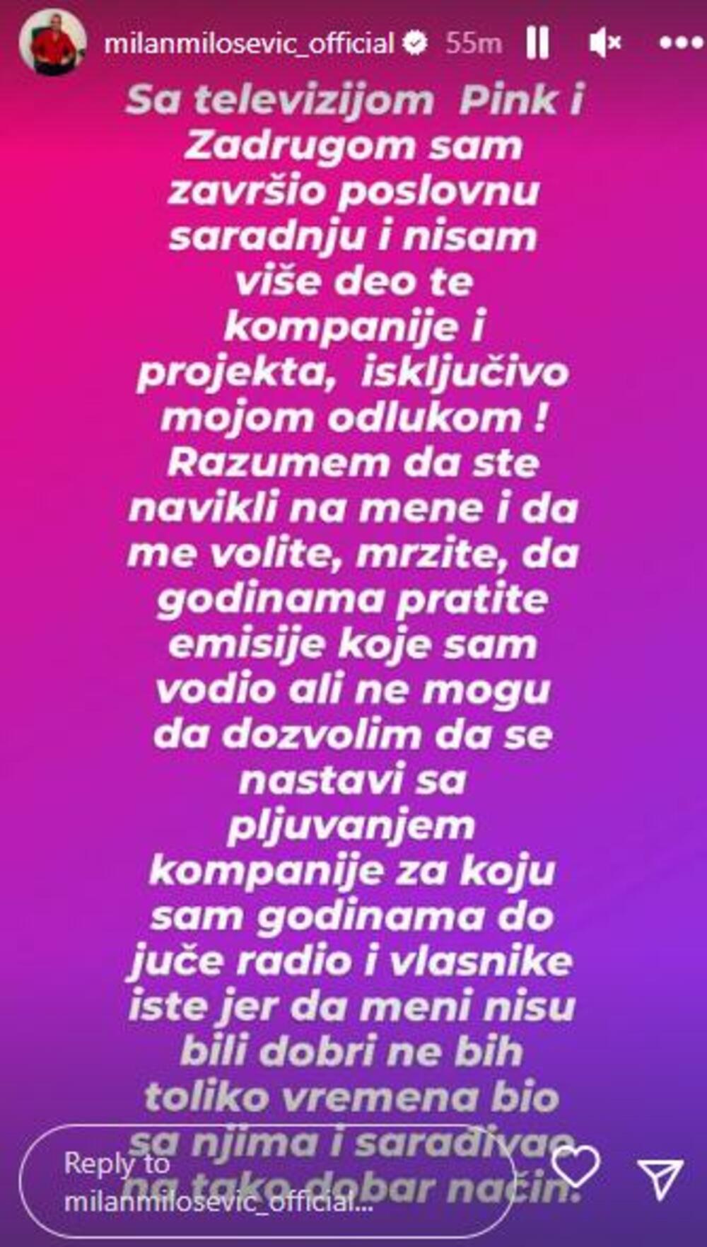 Voditelj Milan Milošević oglasio se na Instagramu i napokon progovorio o odlasku sa televizije Pink.