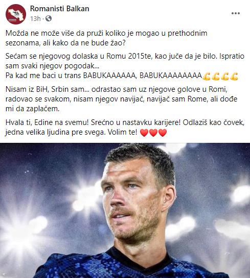 “Hvala ti, Edine na svemu! Sretno u nastavku karijere! Odlaziš kao čovjek, jedna velika ljudina prije svega. Volim te”, napisao je jedan od navijača na Facebook stranici Romanisti Balkan.