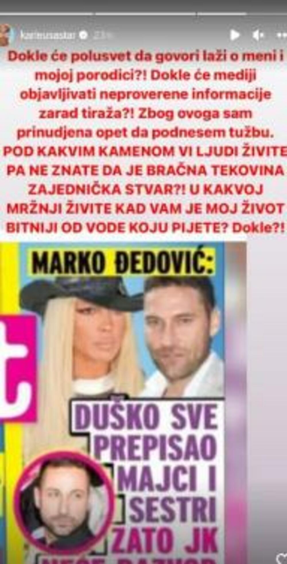 Ona je postavila naslovnu stranu jednog nedeljnika za koji je voditelj Zadruge dao intervju i pričao o Karleušinom braku sa Duškom Tošićem i podelom njihove imovine.