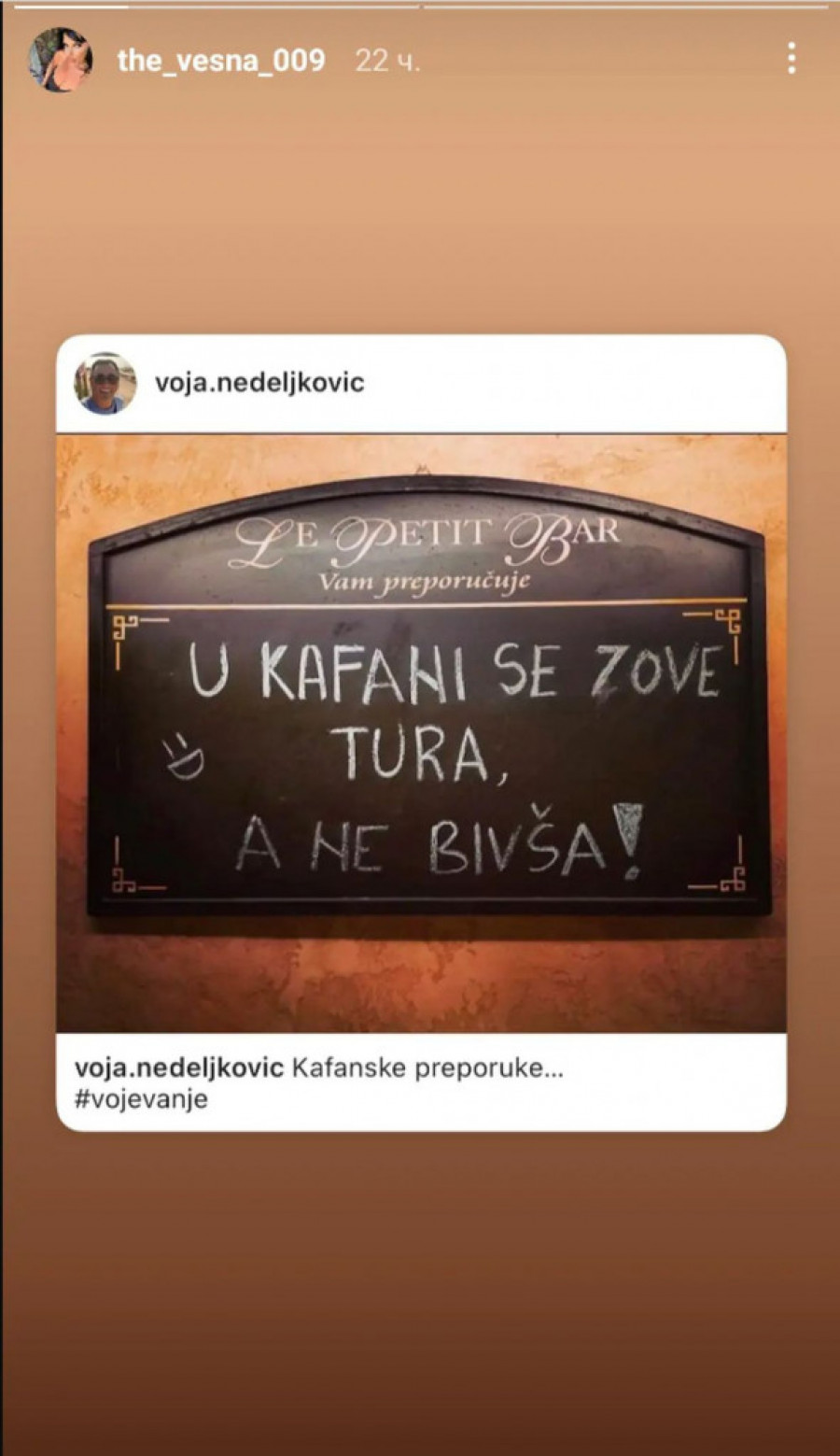 Tako je Vesna juče u storiju objavila šaljivi citat koji kaže: „U kafani se zove tura, a ne bivša“. Drugi post prati Joksimovićeva pesma „Devojka sa polja zelenih“, pa su se neki s razlogom zapitali da li je možda nekome na taj način uputila poruku…