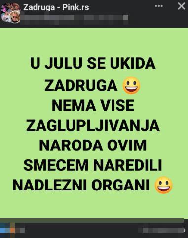 – U julu se ukida Zadruga! Nema više zaglupljivanja naroda ovim smećem, naredili nadležni organi – pisalo je u ovoj objavi koja je naišla na burne reakcije i pozitivne i negativne.