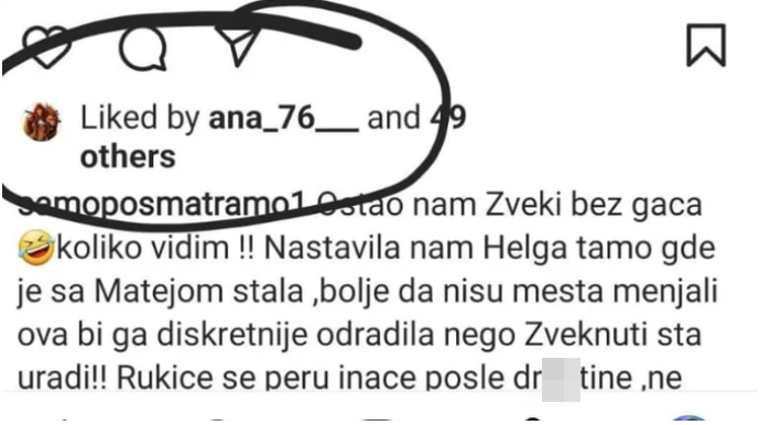 Međutim, čini se da je jedan lajk još zanimljiviji od komentara i snimka! Naime, ovaj pežorativni komentar na račun Anđele i Zvezdana lajkovala je njegova bivša žena Ana, koja ne propušta dešavanja u “Zadruzi”, a kako bi Slavnić i njegova nova draga reagovali kada bi saznali šta se zbiva na društvenim mrežama, ostaje da nagađamo.