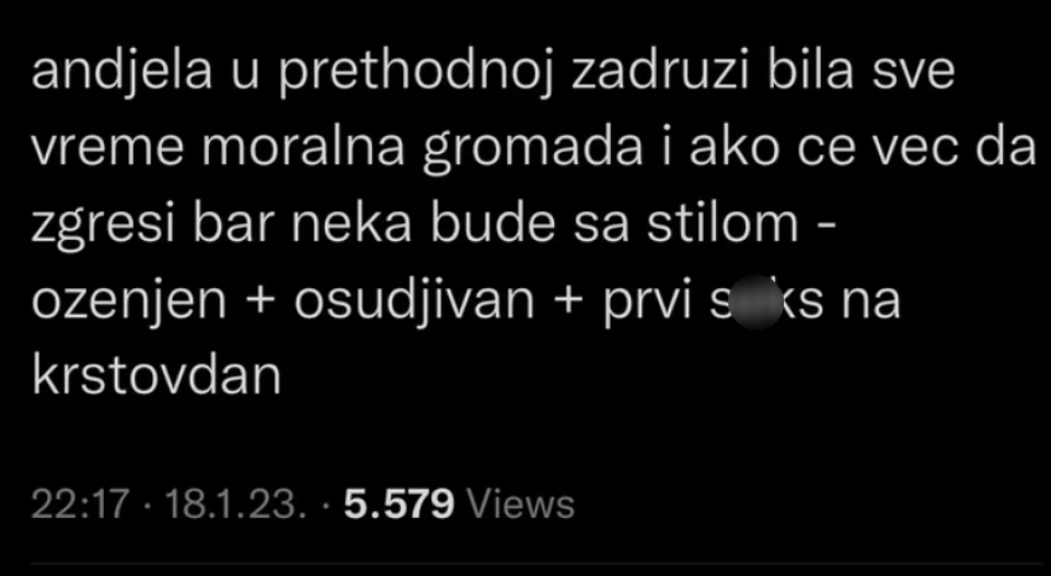 – Anđela u prethodnoj Zadruzi bila sve vrijeme moralna gromada, i ako će već da zgriješi bar nek bude sa stilom – oženjen + osuđivan + prvi s..s na Krstovdan – pisalo je na slici.