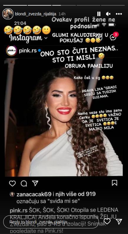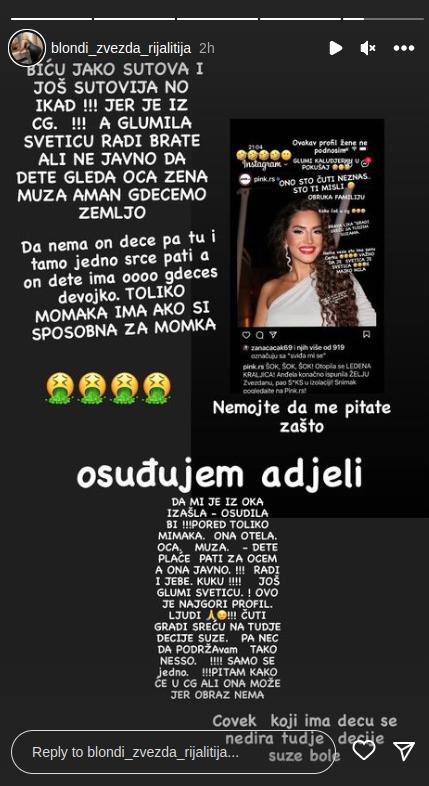 – Da mi je iz oka izašla, osudila bih. Pored toliko momaka, ona otela oca, muža. Dete plače i pati za ocem, a ona javno. Još glumi sveticu, ovo je najgori profil ljudi. Čovek koji ima decu se ne dira, tuđe dečje suze bole – istakla je bivša zadrugarka.