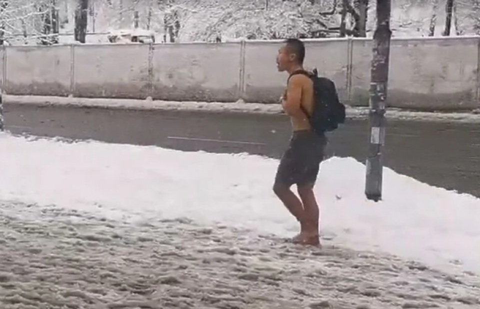 Nepoznati muškarac snimljen je u centru Sarajeva, tačnije na platou Aria shopping centra, kako potpuno bos, bez majice i u šorcu šeta ulicama glavnog grada.