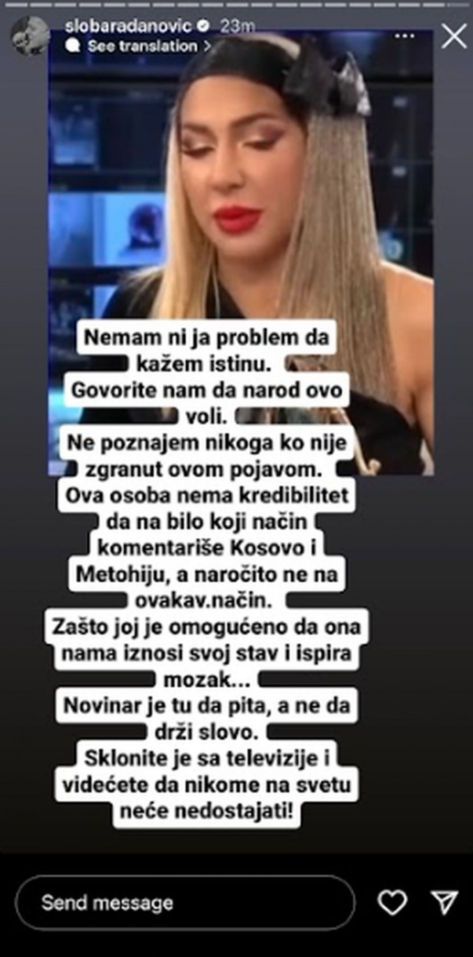 Pjevač Sloba Radanović objavio je na svojoj stori priči izjavu Jovane Jeremić iz jutarnjeg programa u kojoj je spominjala Kosovo i Metohiju i Srbe koji su dole živjeli, i žestoko je isprozivao.