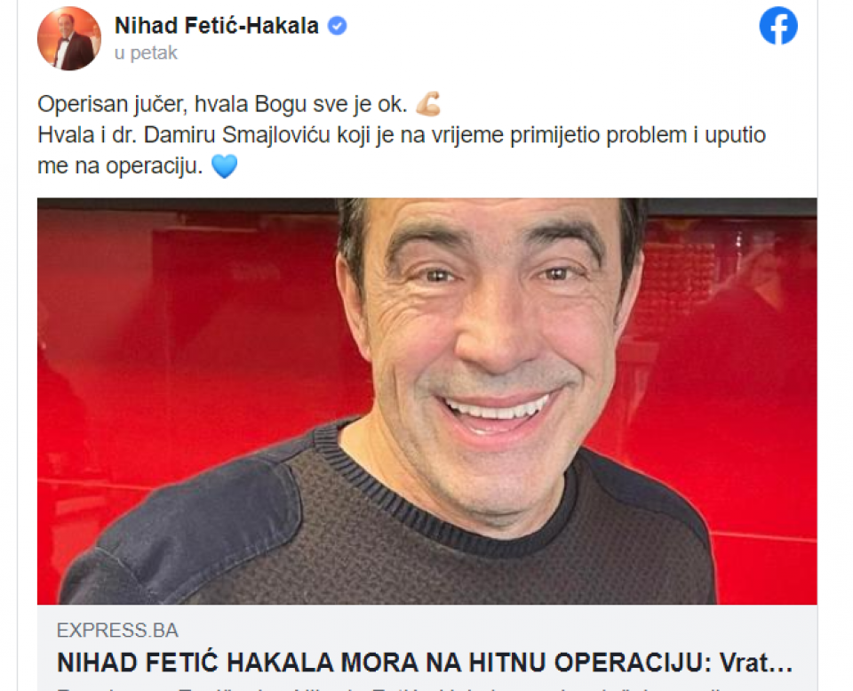 – Operisan jučer, hvala Bogu sve je ok. Hvala i dr. Damiru Smajloviću koji je na vrijeme primijetio problem i uputio me na operaciju.