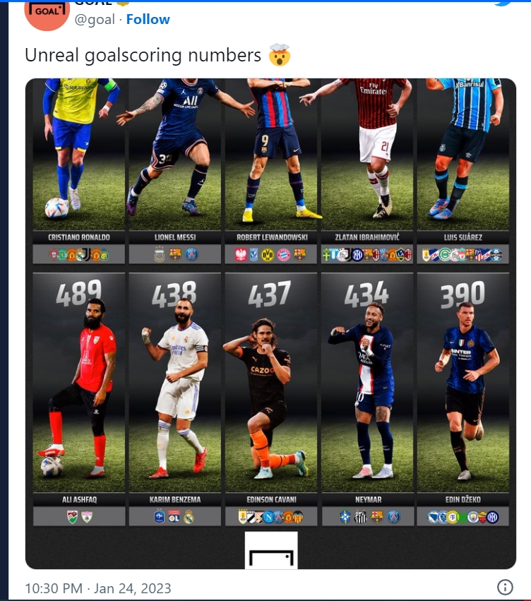 Na prvoj poziciji je Cristiano Ronaldo sa 819 golova, slijede Messi sa 795 golova, dok je treći Robert Lewandowski sa 634 gola.