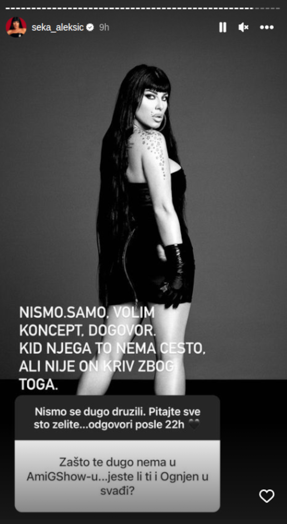 Na Instagramu je sinoć posvetila vreme kako bi odgovarala pratiocima na brojna zanimljiva pitanja, a jedno od njih bilo je zašto je tako dugo nema u emisiji “Ami G šou” i da li je u svađi sa Ognjenom Amidžićem.