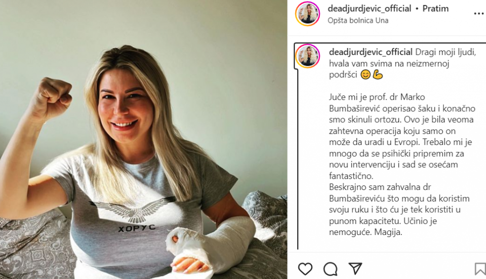 – Dragi moji ljudi, hvala vam svima na neizmjernoj podršci. Jučer mi je prof. dr Marko Bumbaširević operisao šaku i konačno smo skinuli ortozu. Ovo je bila veoma zahtjevna operacija koju samo on može da uradi u Evropi. Trebalo mi je mnogo da se psihički pripremim za novu intervenciju i sad se osjećam fantastično – počela je Dea na Instagramu i dodala: