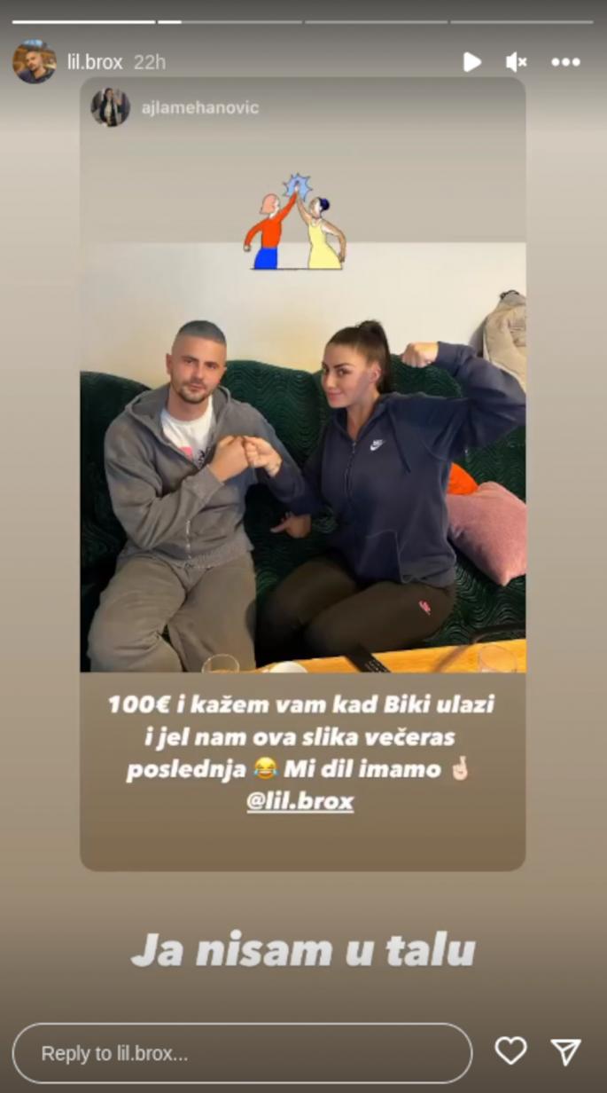 – 100 evra i kažem vam kad Biki ulazi i je l’ nam ova slika večeras poslednja. Mi dil imamo – napisala je Ajla, na šta se Bilal nadovezao sa: “Ja nisam u talu”, i time se ogradio.