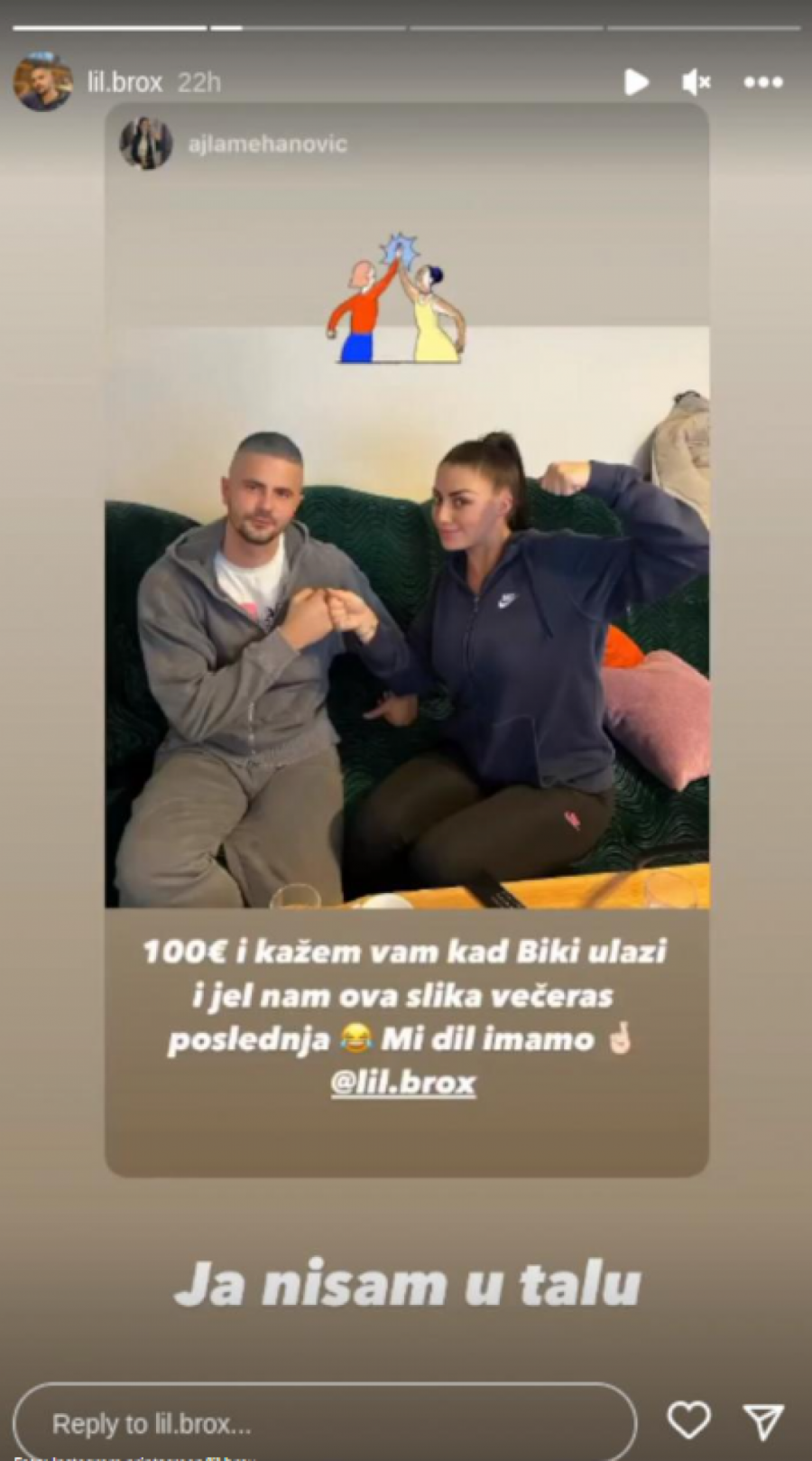 – 100 evra i kažem vam kad Biki ulazi i je l’ nam ova slika večeras poslednja. Mi dil imamo – napisala je Ajla, na šta se Bilal nadovezao sa: “Ja nisam u talu”, i time se ogradio.