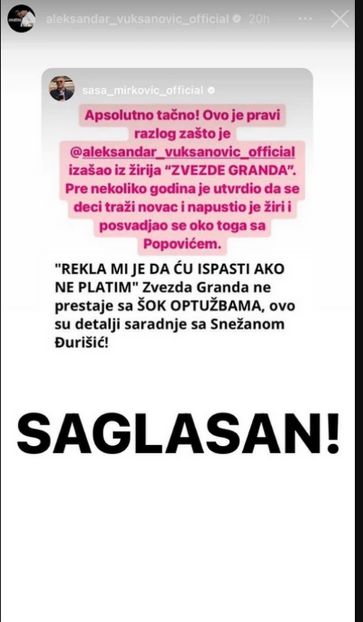 “Apsolutno tačno. Ovo je pravi razlog zašto je Aleksandar Vuksanović izašao iz žirija “Zvezde Granda”. Pre nekoliko godina utvrdio je da se deci traži novac i napustio je žiri i posvađao se oko toga sa Popovićem”, piše na storiju, dok je Lukas na to kratko napisao “Saglasan”.