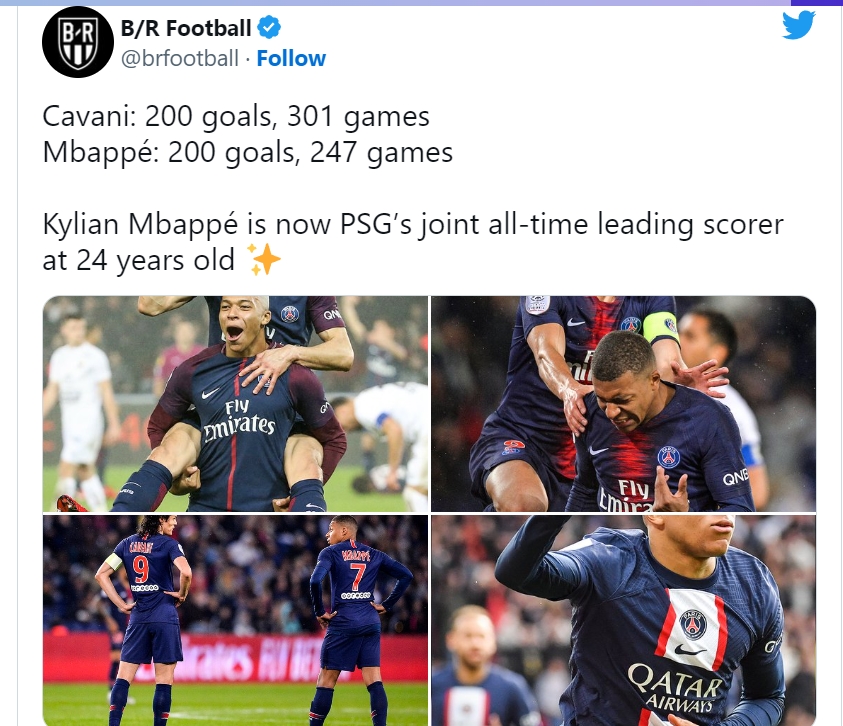 Sada se Mbappe izjednačio na vječnoj listi strijelaca sa Edinsonom Cavanijem, koji je u dresu francuskog velikana također postigao 200 pogodaka u 301 meču. Urugvajac je do ove brojke stigao igrajući sedam godina za PSG, u periodu od 2013. do 2020. godine.